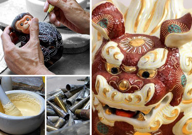 This unique technique is often used in Kutani ornaments such as guardian lions and beckoning cats. It creates three-dimensional patterns and textures by applying a special high-viscosity paint,