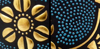 Kleine Punkte in Blau werden auf den Hintergrund aufgebracht, um eine spezielle Textur zu erzeugen. Diese heisst "Aochibu" (青粒), einer Maltechnik von Kutani-Ware bezeichnet. Außerdem ist das goldene Arabeskenmuster lebhaft darauf gemalt, was ihr eine luxuriöses Ausstrahlung verleiht.
