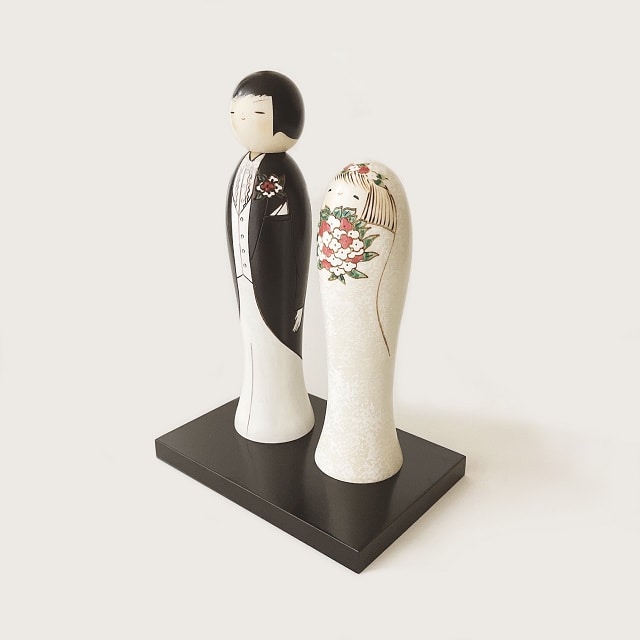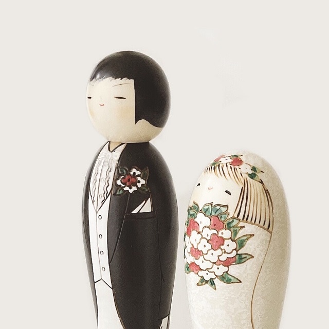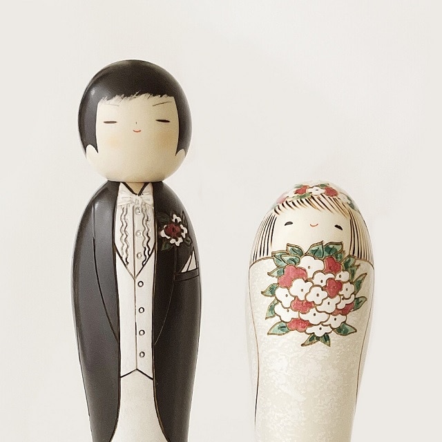 This elegant pair of creative Kokeshi dolls by Usaburo portrays a modern bride and groom in Western wedding attire, beautifully handcrafted in Gunma, Japan.