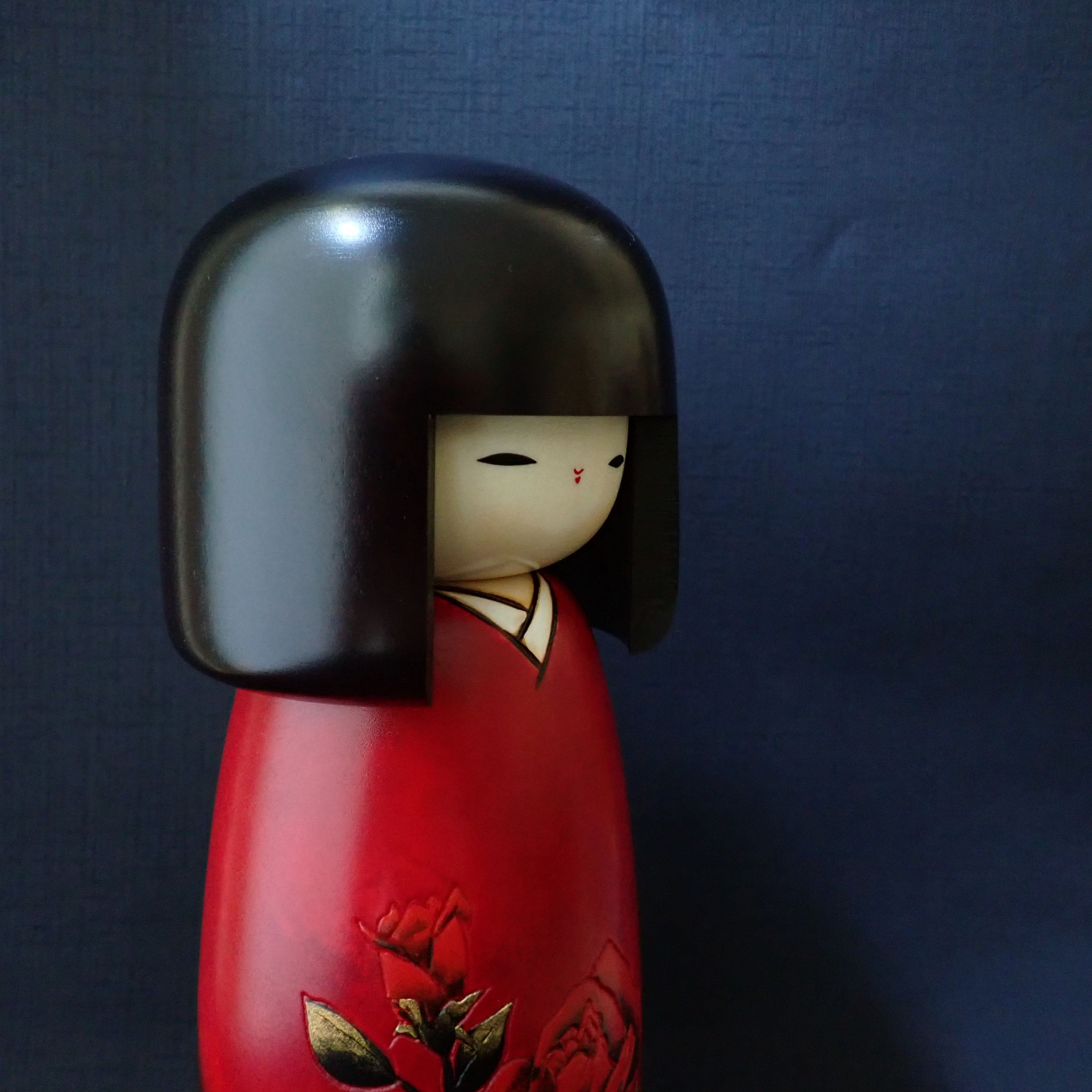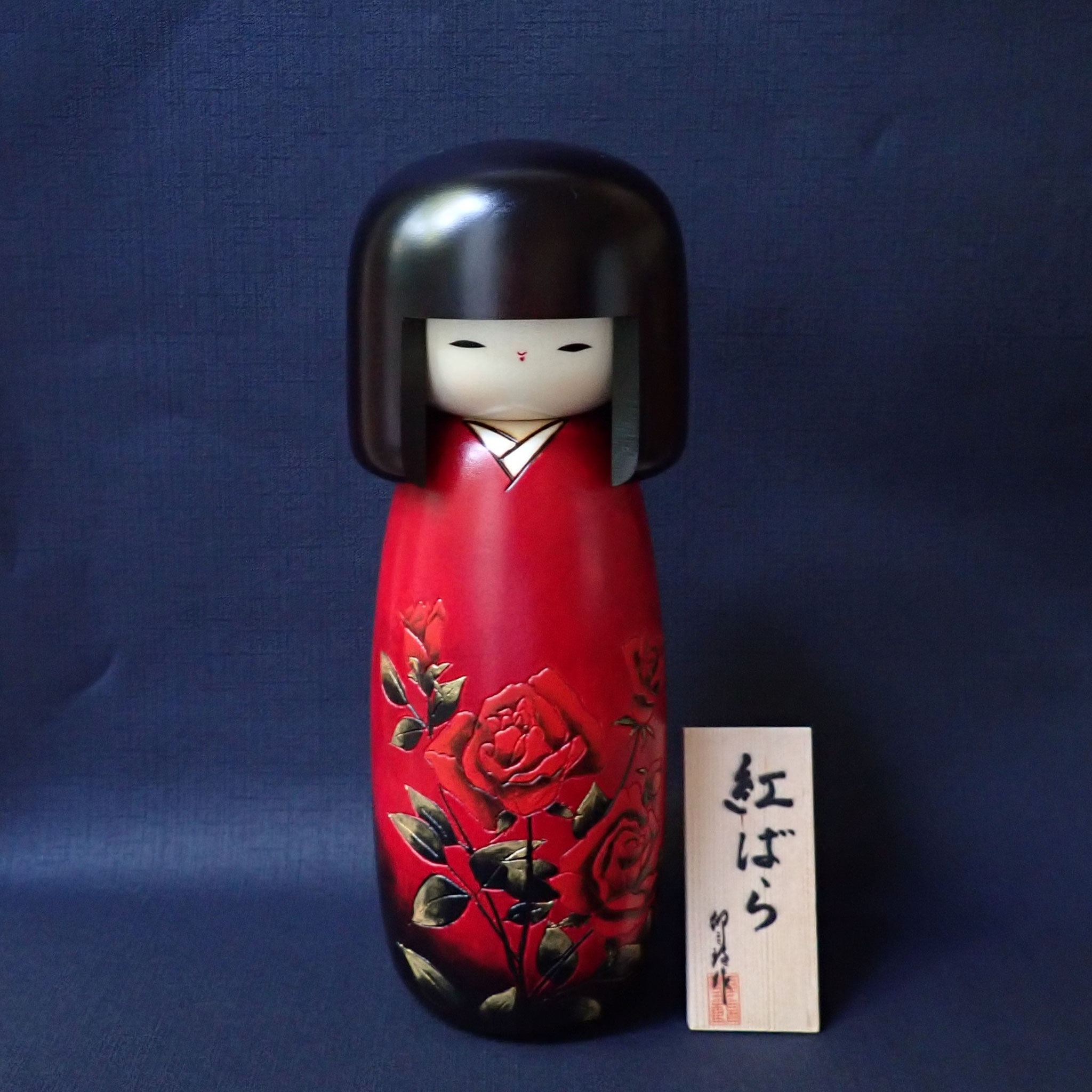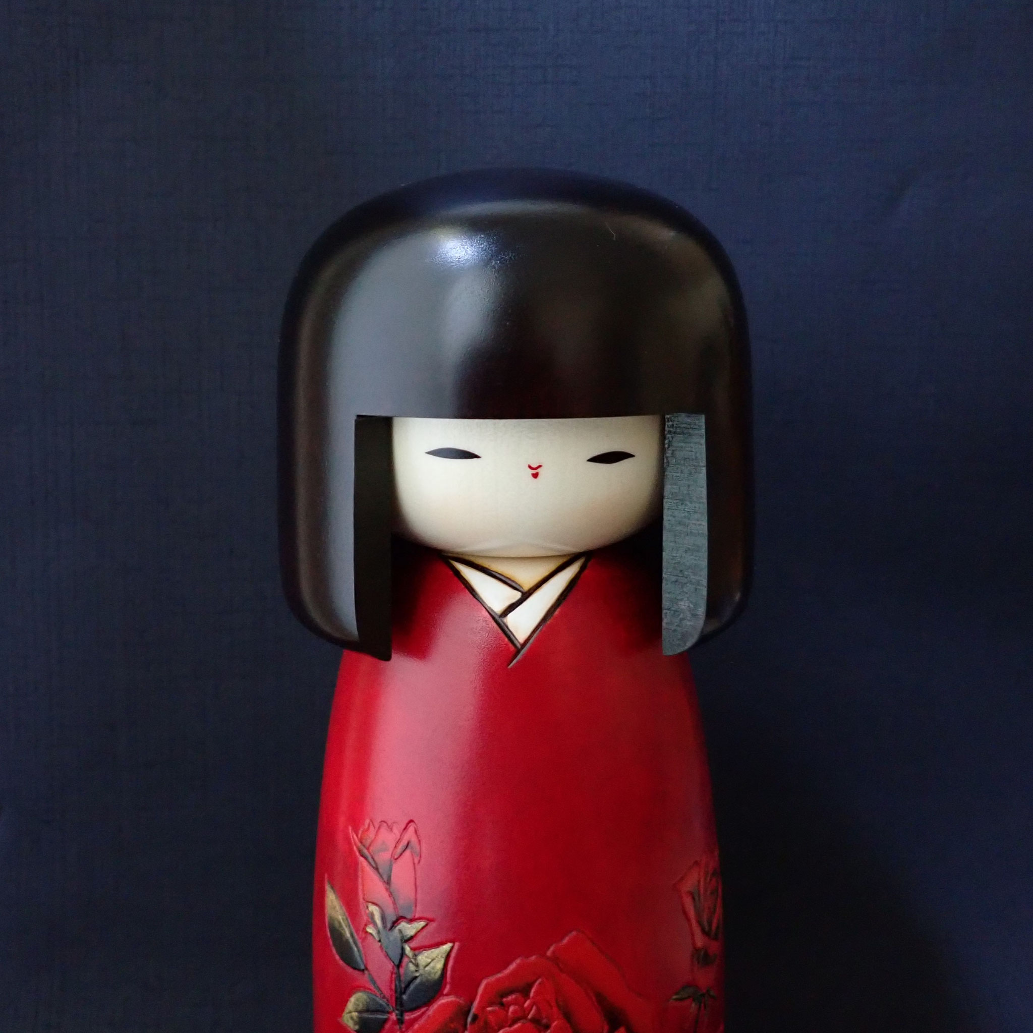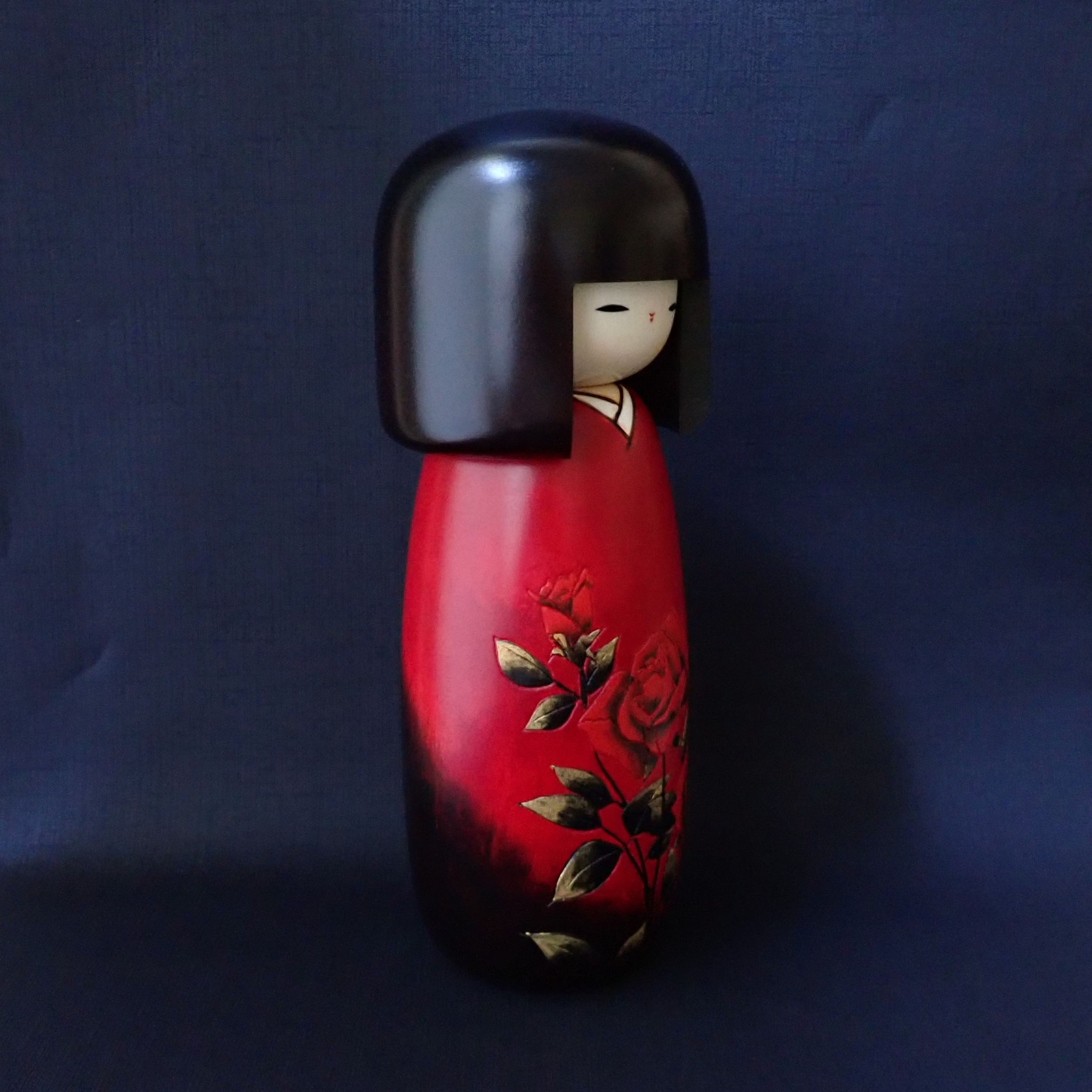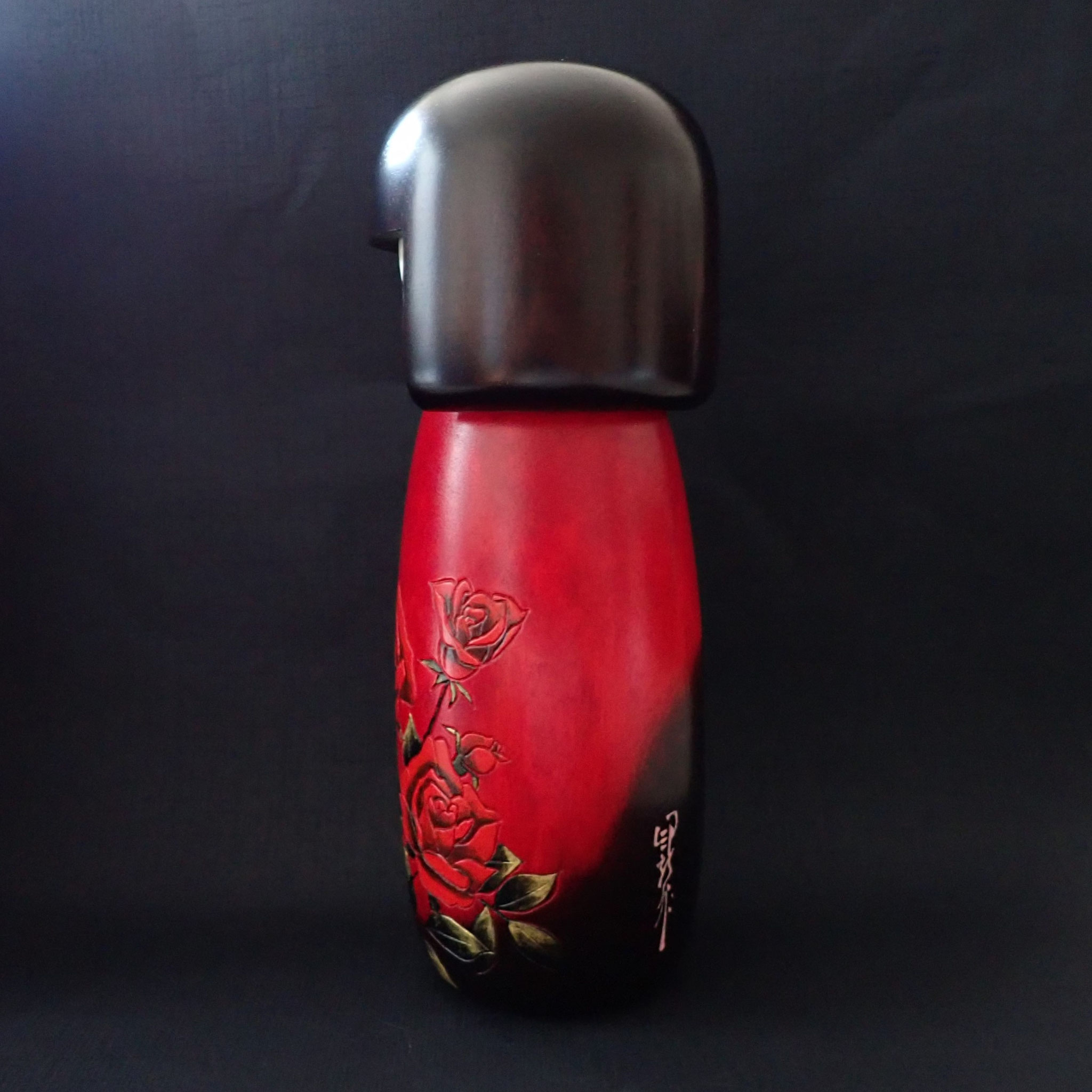 Dieses Kokeshi hat eine prächtige, elegante Erscheinung mit einer kühnen Darstellung Rosen. Die Abstufung von Schwarz und Rot, die das Bild der leidenschaftlichen Liebe heraufbeschwört, betont die bezaubernde Eleganz der Rosen.