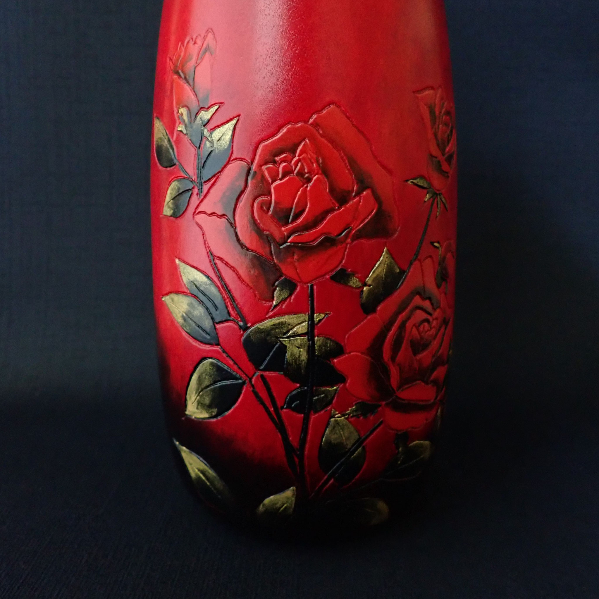 The title ‘beni bara’ means ‘red rose’ and ‘beni’ is a particularly rich and noble shade of red. Roses are a very rare motif used on kokeshi, but in combination with the classical shape and bob hairstyle, the piece has become a retro-modern look.