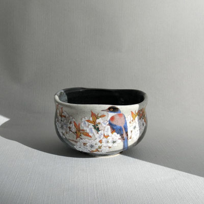 An elegant matcha tea bowl features a bird with white cherry blossoms on the warm grey & white ware. Kutani ware uses a brush for painting with Japanese coloring paints, as you can see the painted bird and flowers are slightly thickened and standing out. The white glaze on the gray base even more adds warmth to the bowl. (The degree of white glaze flow varies from piece to piece, please understand in advance.)