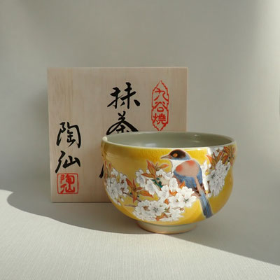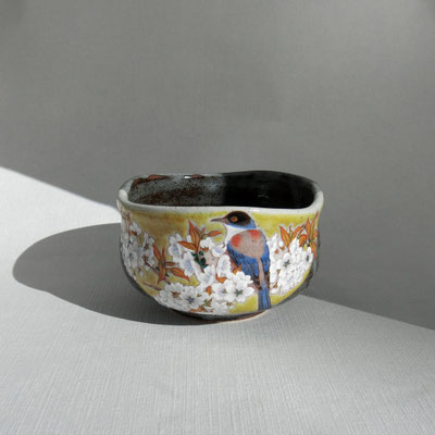 Artfully painted matcha tea bowl features a bird with white cherry blossoms on the warm yellow glaze drawn in the Kutani Yoshidaya Style. Kutani-ware uses a brush for painting with Japanese coloring paints, as you can see the painted bird and flowers are slightly thickened and standing out. The white glaze on the gray base even more adds warmth to the bowl. (The degree of white glaze flow varies from piece to piece, please understand in advance.)