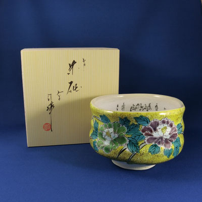 Diese wunderschöne Matcha-Schale ist mit großen Pfingstrosen im Yoshidaya-Stil verziert. Der Yoshidaya-Stil, ein repräsentatives Design der Kutani-Ware, zeigt naturbezogene Motive und einzigartige, lebendige Farben. Auf der Innenseite ist ein klassisches japanisches Gedicht in Pinselstrichen geschrieben.