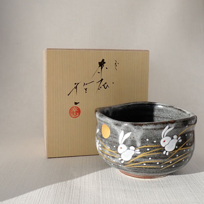 Matcha tea bowl with a motif of rabbits hopping across a meadow under the full moon. The distinctive wavy shape that suggests the beauty of nature gives you comfort and fits your hand nicely. The white glaze on the grey base even more adds warmth to the bowl. (The degree of white glaze flow varies from piece to piece, please understand in advance.)