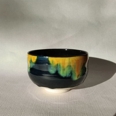 Diese Matcha-Schale wird mit der künstlerischen "Yusai"-Glasurtechnik hergestellt und hat einen auffälligen, einzigartigen Glasurverlauf. Die kontrastreiche Abstufung von leuchtendem Gelb zu Blaugrün auf tiefem Indigo-Grund verleiht diesem Stück ein echter Blickfang und sehr dramatisch und auch anspruchsvoll.
