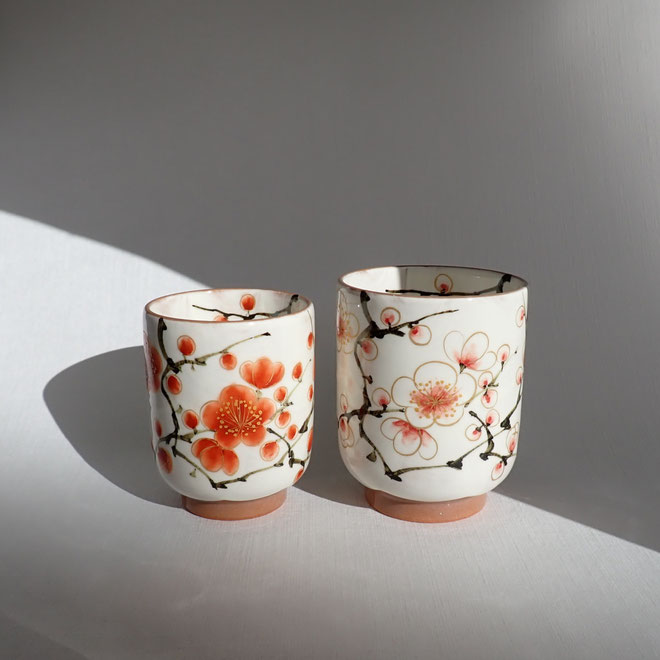Die Werkstatt Touan ist bekannt für ihre herausragenden Zeichnungen und meisterhaft gemalten Blumen- und Pflanzenmotive. Dieses Werk besticht durch die für Touan typische Farbgebung: Auf weißer Glasur erstrahlen rote und weiße Pflaumenblüten, fein mit Gold akzentuiert – ein festliches und glücksverheißendes Design.